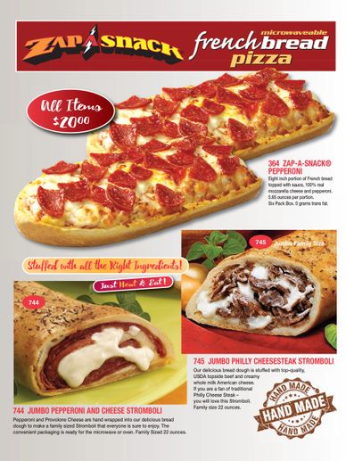 Features Zap-A-Snack pepperoni and our popular stromboli line.